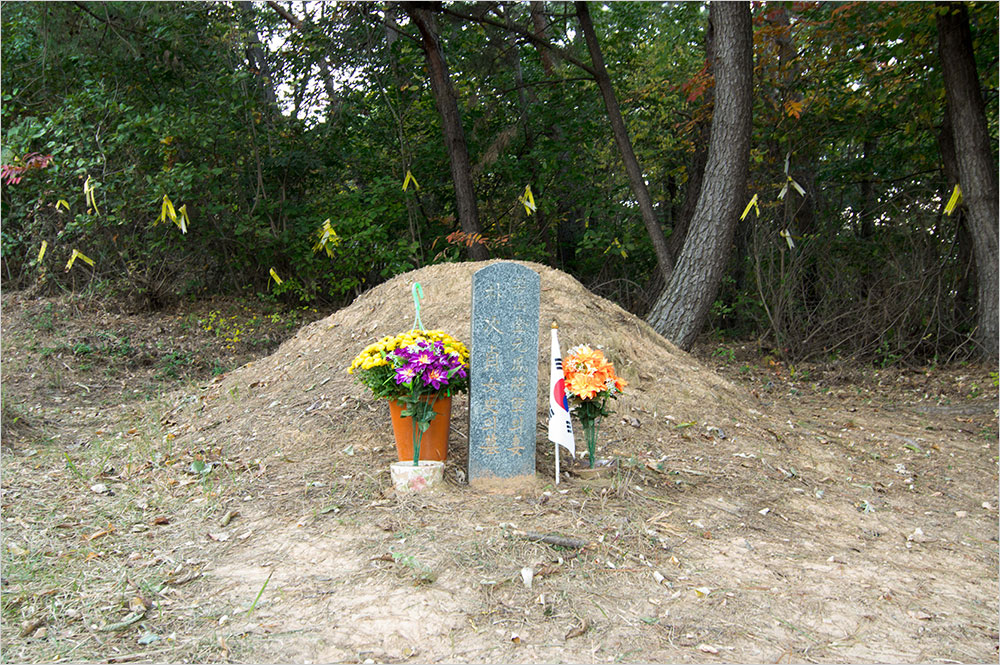 밀양시 부북면에 있는 박차정 여사의 무덤을 찾은 것은 그다음이다. 이정표가 잘되어 있어 이내 산 중턱에 있는 묘소를 찾긴 했는데 공동묘지 한쪽에 주저앉은 봉분에 풀 한 포기 없는 묘 앞에서 우리는 잠깐 말을 잃었다. 비석 옆에 꽂힌 태극기와 조화 몇 송이가 아니었다면 누가 거기서 조국을 위해 스러져 간 투사의 자취를 알아볼 것인가.