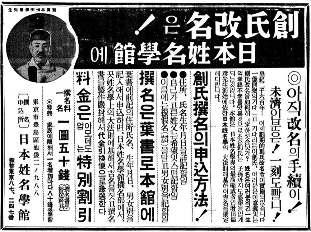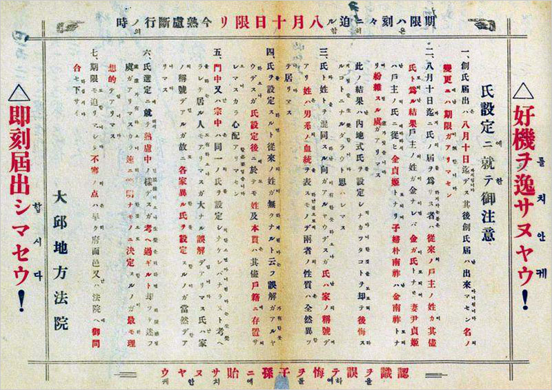 1939년 11월 10일, 조선총독부는 ‘조선민사령(朝鮮民事令) 중 개정의 건’(제령 제19호)과 ‘조선인의 씨명에 관한 건’(제령 제20호)을 공포하였다. 이로써 조선에서도 일본식 씨명제(氏名制)를 따르도록 규정하고, 1940년 2월 11일부터 8월 10일까지 ‘씨(氏)’를 정해서[창씨(創氏)] 제출할 것을 명령하였다. 일본식 성씨를 만드는 ‘창씨(創氏)’가 핵심이었던 이 제도의 내용은 다음과 같았다.