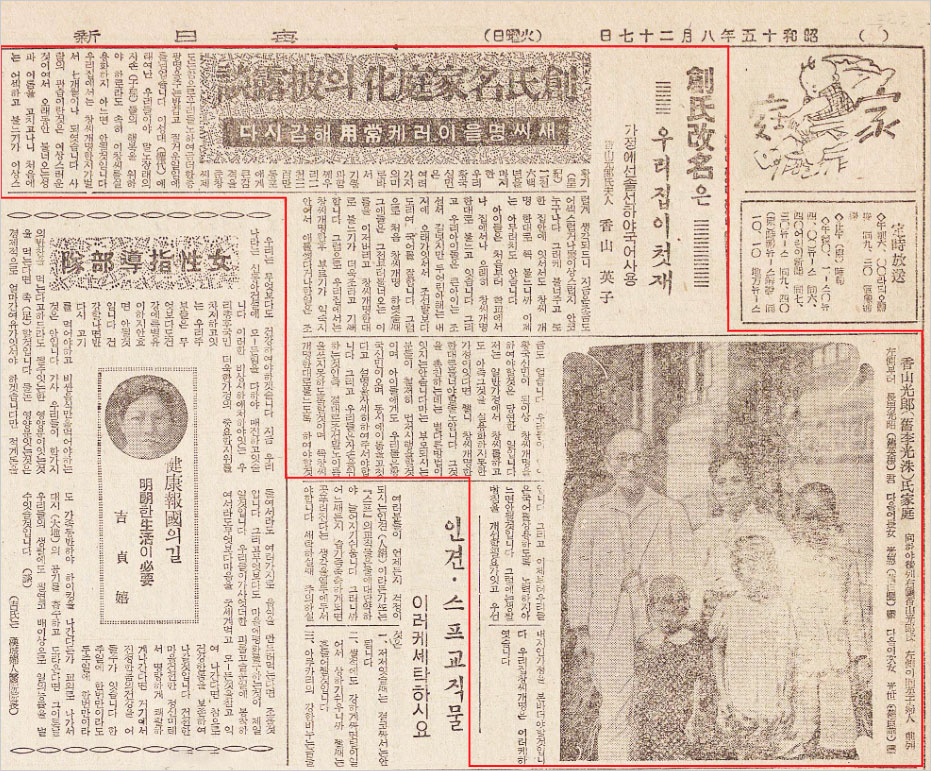 “지금으로부터 2600년 진무 천황께옵서 어즉위(御卽位)를 하신 곳이 가시하라(橿原)인데 이곳에 있는 산이 가구야마(香久山)입니다. 뜻깊은 이 산 이름을 씨로 삼아 ‘향산(香山)’이라고 한 것인데 그 밑에다 ‘광수’의 ‘광’ 자를 붙이고 ‘수’ 자는 내지(內地) 식의 ‘랑’으로 고치어 ‘향산광랑’이라고 한 것입니다.”