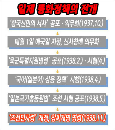 그것은 1937년 가을부터 조선에서 ‘황민화’와 ‘징병’을 촉진하고자 쏟아내기 시작한 ‘기반적 동화정책’의 최종판이라 해도 좋은 것이었다. 일제는 1937년 10월에 황국신민으로서 충성을 맹세하는 ‘황국신민의 서사(誓詞)’를 공포하여 모든 행사에서 ‘국민의례’로 제창하도록 의무화했다.