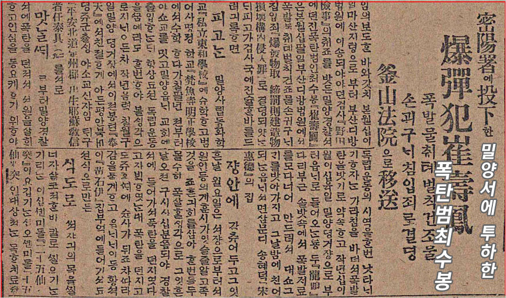 [역사 공부 ‘오늘’] 1920년 12월 27일, 최수봉 의사, 밀양경찰서 폭탄투척 의거