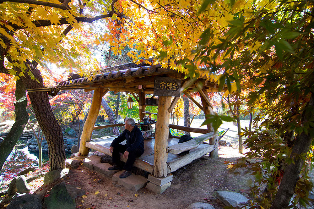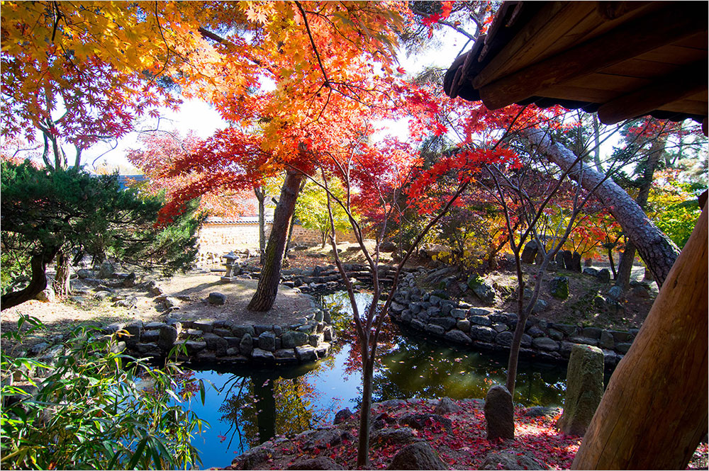 사랑채에서 정원으로 통하는 협문(일각문)으로 들어서자마자 나는 내가 만날 풍경이 예사롭지 않으리라는 걸 단박에 눈치챘다. 소나무, 향나무, 대나무, 상수리나무, 산수유나무, 측백나무가 어우러진 작은 숲속에 단풍나무가 은은한 붉은 등불을 켜고 있었던 까닭이다. 이후 한 시간 남짓 정원 곳곳을 돌며 그 풍경을 렌즈에 담으면서 나는 연신 탄성을 내지르지 않을 수 없었다.