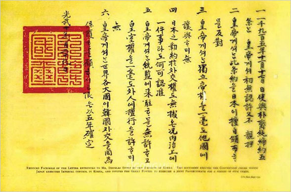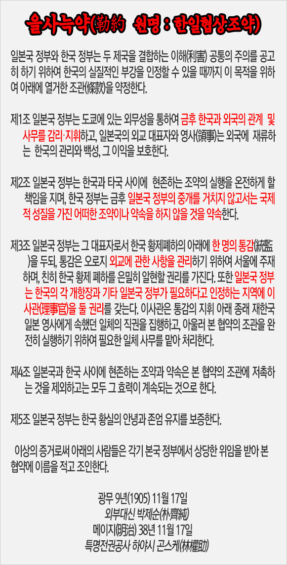 그리고 같은 날짜로 한국 외교권의 접수, 일본 통감부(統監府)의 설치 등을 중요 내용으로 하는 ‘을사조약’(일본에서는 ‘제2차 일한 협약’이라 부름)을 외부대신 박제순과 일본공사 하야시 사이에 체결 조인하고 18일에 이를 발표하였다.