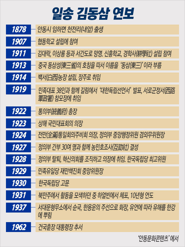 서로군정서(西路軍政署)와 같은 군사 조직을 만들어 무장투쟁을 전개했던 일송 김동삼은 비타협적으로 일제에 저항했던 진보적 중도 민족주의자였다. 당시 부르주아 민족주의 독립운동과 사회주의 독립운동으로 나뉘었던 독립운동 세력 사이에서 그는 민족통합을 우선으로 두고, 좌우 통합을 위해 노력했으며, 이념에 유연하고 개방적이었다.