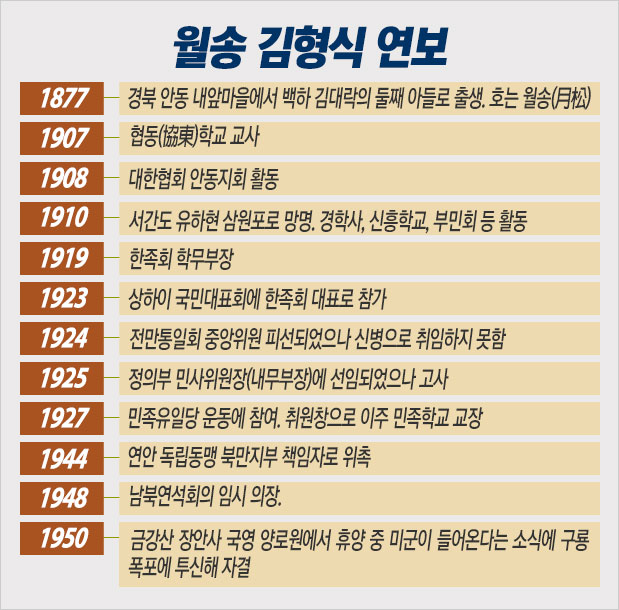 월송 김형식(1877∼1950)은 백하 김대락의 아들이다. 월송은 1914년 망명지에서 부친 백하를 잃었다. 향년 70세. 월송은 1919년 결성된 한족회 학무부장으로 민족교육에 힘썼고, 1920년 경신참변(간도 참변: 1920년 일제에 의해 저질러진 간도 지방의 한국인 대량 학살 사건)을 수습했다.