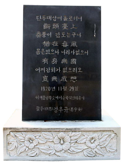 1920년 11월 29일 오전 10시 30분, 서대문형무소 형장에서 사형집행으로 ‘백발의 독립투사’ 강우규(姜宇奎, 1855~1920) 의사가 순국하였다. 1919년 9월, 남대문 정거장(지금의 서울역)에서 폭탄 거사를 감행한 지 14개월 만이었다. 그는 처형 직전에 유언 대신 ‘사세시(辭世詩)’ 한 수를 남겼다.