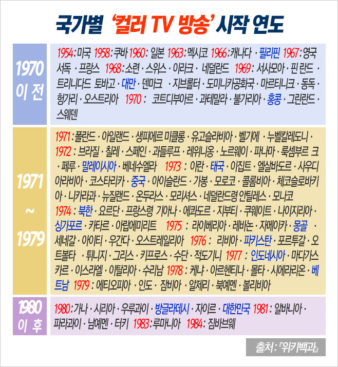 나라별 컬러TV 방송 시작 연도를 보면 당시 우리나라는 세계적으로 가장 늦게 컬러TV 방송을 시작한 나라에 포함된다. 아시아 국가 가운데 필리핀(1966), 대만(1969), 홍콩(1970)은 1970년 이전에, 말레이시아(1972), 태국·중국(1973), 북한·싱가포르(1974), 몽골(1975), 파키스탄(1976), 인도네시아(1977), 베트남(1978), 인도(1979) 등은 80년 이전에 컬러TV 방송을 시작했다.
