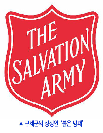 구세군의 상징은 ‘붉은 방패(RED SHIELD)’, 면류관(Crest), 구세군 기, 제복 등 여럿이 있다. 붉은 방패는 구세군의 사회봉사 사역의 상징으로 국제적으로 사용된다. 처음엔 ‘구세군(The Salvation Army)’이라는 글자가 비스듬히 쓰인 장식 은으로 만든 방패 모양이었는데, 나중에 은 대신 빨간 에나멜로 바꾸었다. 우리나라에선 영문 대신 한글 ’구세군‘을 세로로 쓴다. 거리의 자선냄비 위쪽에 이 방패가 있다.