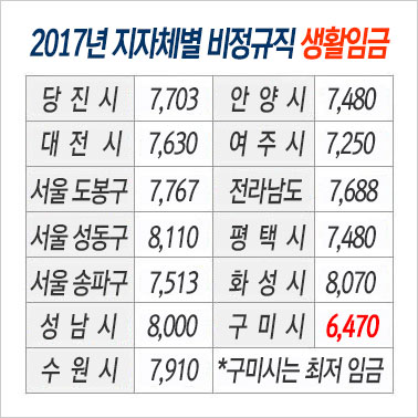 구미시가 책정한 2017년도 비정규직 시급은 6.1% 인상된 6,500원이다. 이는 최저임금 인상분 7.3%는 물론 다른 대부분의 지자체에서 채택하고 있는 비정규직에 대한 ‘생활임금’에도 미치지 못하는 초라한 액수이다.