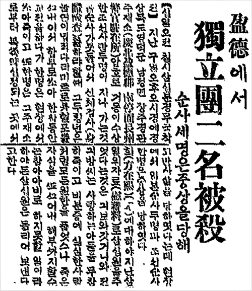 1923년 12월 김명제(2003 건국훈장 애국장)가 장춘에서 무기를 수령하는 임무를 수행하다가 발각되어 출동한 일본군 수비대에 맞서 맹렬히 싸우다가 전사 순국하였다.