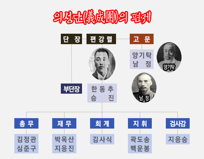 의성단의 근거지는 봉천성 회덕현·장춘현·길림성·하얼빈 등 27개소였고, 단원은 모두 250여 명에 이르렀다. 단기간에 단원을 훈련하는 훈련소를 설치하고 단원들은 농민이 편안하게 농사를 지을 수 있도록 돕고, 부정분자의 망동을 저지하여 불의의 변고를 방지하도록 하였다.