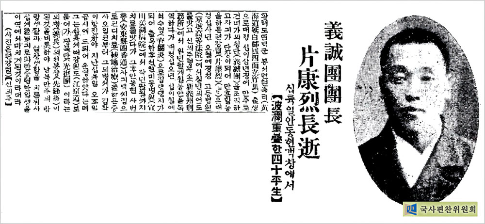 1928년 1월 16일, 만주 안둥(安東) 병원에서 편강렬(片康烈, 1892~1928) 의성단장이 순국하였다. 선생은 3년 전 하얼빈에서 일경에 체포되어 7년 형을 선고받고 복역 중 혹독한 고문으로 발병, 보석으로 석방되어 치료 중이었다. 향년 36세.