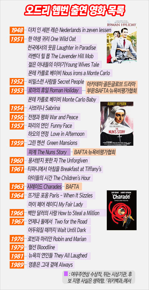 이후 <로마의 휴일>(1953)에서 주연을 맡아 일약 스타덤에 올랐다. <사브리나>(1954), <파계>(1959), <티파니에서 아침을>(1961), <샤레이드>(1963), <마이 페어 레이디>(1964), <어두워질 때까지>(1967)와 같은 성공적인 여러 영화에 출연했다.