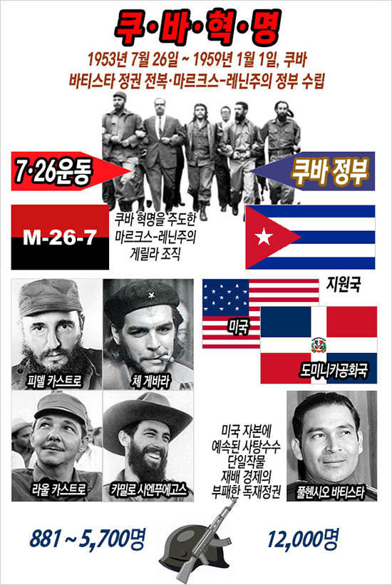 체 게바라와 카밀로 시엔푸에고스, 라울 카스트로 등이 이끄는 쿠바의 청년 게릴라 전사들은 1958년 12월 산타클라라 전투에서 결정적인 승리를 거두었고, 독재자 바티스타는 포르투갈로 탈출하였다. 그리고 1959년 1월 1일, 마침내 ‘7월 26일 운동’ 세력의 주력 부대가 아바나에 진입하였다. 그것은 1953년 7월 26일 시작된 쿠바혁명의 완수였다.