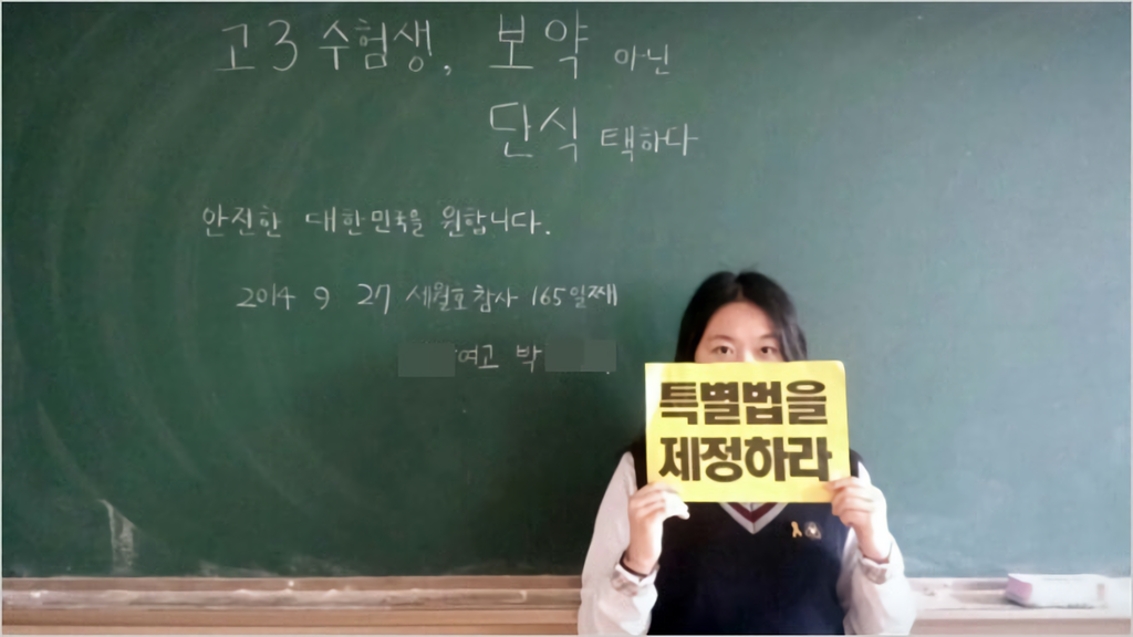 종이에는 굵직한 글씨로 ‘특별법을 제정하라’고 쓰여 있다. 칠판에는 이 여학생이 썼음 직한 단정한 글씨로 다음과 같이 씌어 있다.