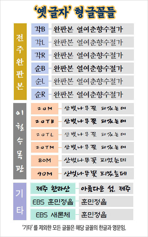 ‘방각본체’는 말 그대로 ‘방각본 소설’에 쓰인 서체다. ‘여사서’는 영조 때 간행한 <여사서(女四書)>, ‘화룡도’는 중국소설 <삼국지연의>에 나오는 ‘적벽대전’을 다룬 한글 소설 <화용도(華容道)>에 각각 쓰인 글씨를 기초로 만든 글꼴이다.