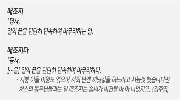 이틀이나 걸려서 답을 받았는데 좀 허무하다. 근거를 물었는데 답만 달랑 내민 것이다. ‘매조지하다’가 쓰일 수 있는 말이라면 ‘매조지’ 아래에 표제어로 올리고 용례를 왜 붙이지 않았을까. 궁금증은 더 깊어지는데, 입맛이 쓰다.
