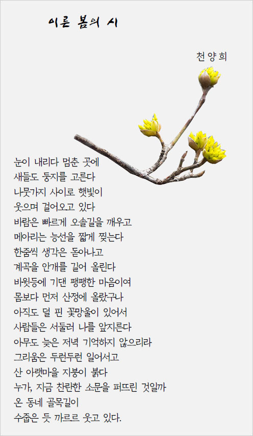 천양희(1942~ ) 시인의 ‘이른 봄의 시’를 찾아 읽었다. 겨우내 잠들어 있던 물상들이 천천히, 그리고 가볍게 몸을 움직이는 봄을 시인은 담담하게 서술한다. ‘햇빛이 웃으며 걸어오고’, ‘바람은 빠르게 오솔길을 깨우고’, ‘메아리는 능선을 짧게 찢’으며 사라진다.
