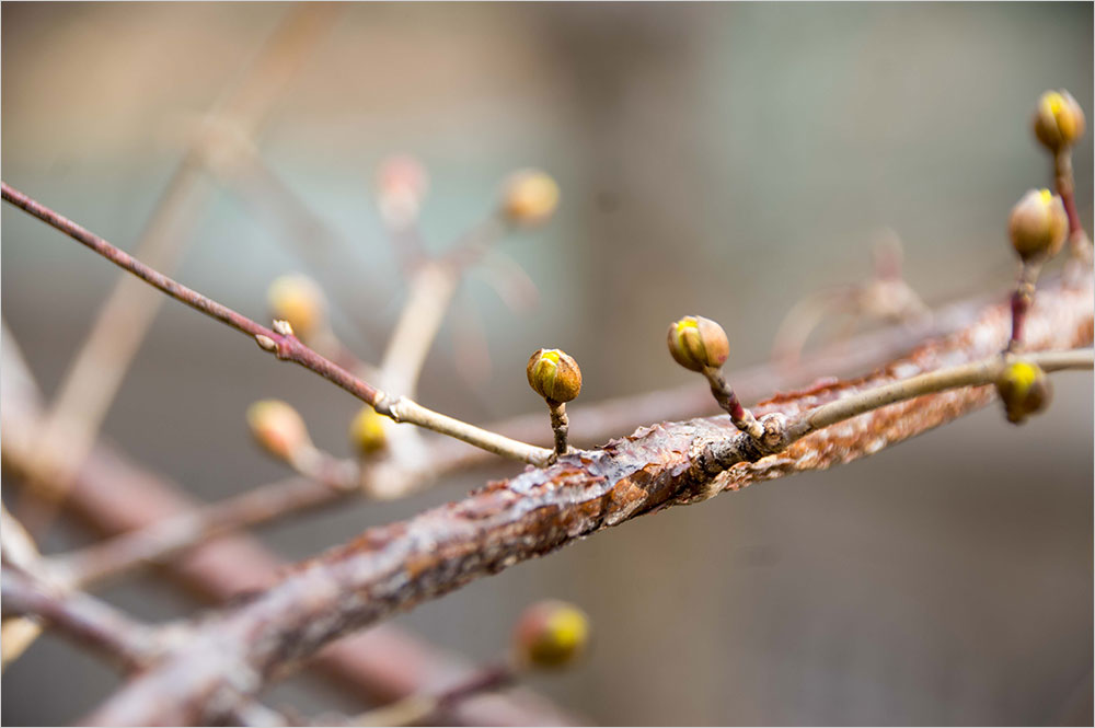 어럽쇼, 그럼 산수유도 때가 되었다 싶어서 그 앞의 산수유를 살펴보았다. 아니나 다를까, 아직 꽁꽁 닫고 있긴 하지만 산수유 겨울눈이 노랗게 망울을 맺고 있었다. 우정 이미 봄이 와 있다는 생각이 어긋나지 않은 것이다.