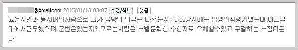 위의 예와는 다소 차이가 있긴 하지만, 역시 그 진의가 별로 이해되지 않는 댓글은 ‘고은 선생과 노벨상’을 다룬 글에 붙은 것이다. 자신의 전자우편 주소를 이름 대신 쓰고 있으니 단순한 익명을 쓴 위의 예와는 ‘질이 다르다’라고 할 수 있다.
