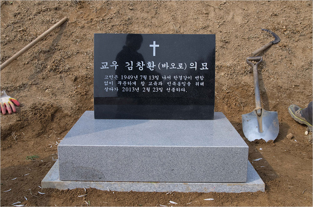 선생은 화장 후 안기동 천주교 묘원에 묻혔다. 그곳은 23년 전인 1990년, 우리 해직 교사들이 배주영 선생을 묻은 곳이다. [관련 글 : 그가 간 지 30년……, 팩스 한 장으로 되돌려진 ‘법외노조’] 우리는 바람 부는 산 위에서 한 줌의 뼛가루로 돌아온 당신을 묻고 그 위에 검은 빗돌 하나를 세웠다. 한 인간의 삶을 단지 한 문장으로 줄일 수 있다는 것은 다행이다. 그 행간의 뜻은 모두가 새기고 새길 일이다.