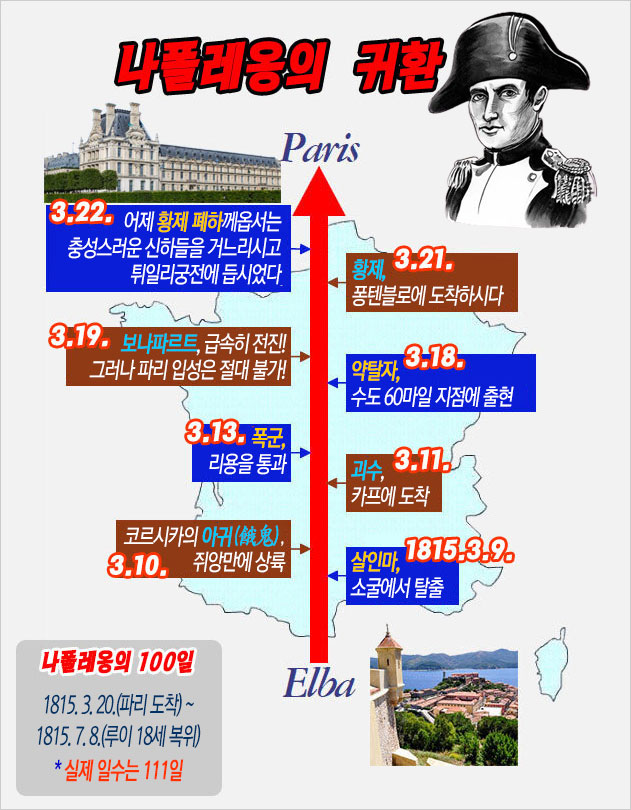 1815년 2월 26일, 나폴레옹 보나파르트(Napoléon Bonaparte, 1769~1821)는 유배 중이던, 이탈리아반도 서쪽 티레니아해(Tyrrenian Sea)의 토스카나 제도에서 가장 큰 섬 엘바(Elba)를 탈출했다. 1814년 4월 퐁텐블로 조약에 따라 엘바섬으로 유배된 지 9개월 21일 만이었다. 그는 황제의 지위를 유지한 채 세습되지 않는 엘바 공국의 대공으로 섬에서 머물다가 영국군의 감시를 피해 엘바섬을 벗어난 것이었다.