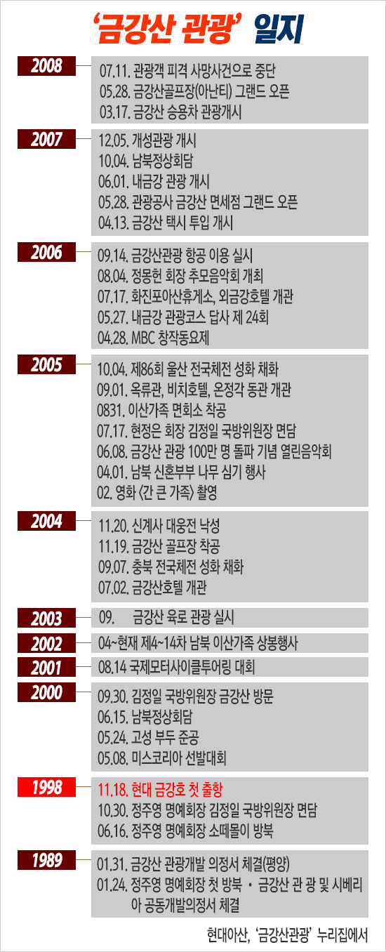 분단에 이어 전쟁까지 치른 남북한이 민족의 명산 ‘금강산’을 매개로 시작한 이 사업이 이루어질 수 있었던 것은 전적으로 현대그룹 정주영 명예회장의 공이었다. 사업에 관한 한 동물적인 감각을 지니고 있었던 이 실향민 출신의 재벌 총수는 남북이 교류하기 위해서 무엇이 필요한지를 알고 있었다.