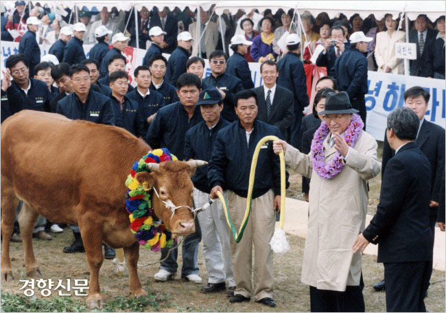 그는 1989년 1월 처음으로 북한을 방문하여 금강산 관광개발 의정서를 체결했고 1998년 6월에는 소 500마리를 실은 트럭 50대를 끌고 군사분계선을 넘었다. 10월에 다시 방북한 그는 북한의 김정일 국방위원장을 면담할 수 있었고 1달 후 마침내 역사적인 금강산 관광이 시작된 것이었다.