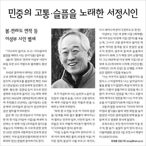 ‘벼’의 시인 이성부(1942~2012) 선생이 돌아가셨다. 시인의 죽음 따위는 세상이 별로 기리지 않는가, 지난달 29일에 <한겨레>에 난 선생의 부음 기사 외에 선생을 다룬 기사는 별로 눈에 띄지 않는다. 그는 모모한 시인들처럼 ‘유명’하지도 않고 모모한 시인처럼 감옥을 다녀온 ‘투사’도 아니어서일까.