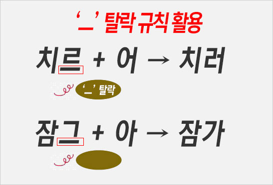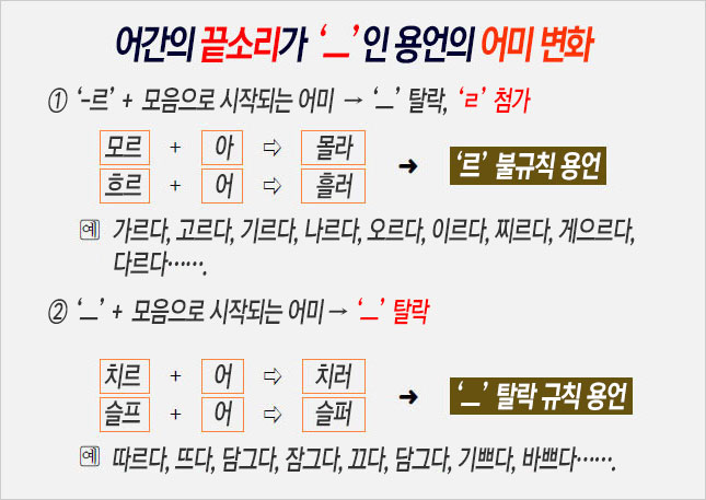 어간의 끝소리가 ‘ㅡ’인 용언의 어미 변화는 두 가지 형태다. ‘흐르다’, ‘빠르다’ 등의 활용과 같이 ‘ㅡ’는 탈락하고 ‘ㄹㄹ’ 형태로 변하는 ‘르’ 불규칙 활용이 하나요, ‘치르다’와 같이 어간의 끝소리 ‘ㅡ’가 어말어미 ‘-아/-어’로 시작되는 어미 및 선어말 어미 ‘-았-/-었-’ 앞에서 탈락하는 활용이 하나다.