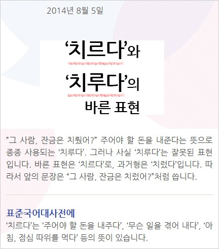 끝소리가 ‘ㅡ’인 동사 가운데 어떤 낱말들은 ‘ㅡ’가 아닌 ‘ㅜ’로 발음하는 사람이 꽤 많다. ‘치루다’(치르다), ‘잠구다’(잠그다) 같은 말이 그렇다. 잘못이라고 신문이나 방송 등 여러 매체에서 끊임없이 지적하는데도 이런 쓰임은 여전히 이어지고 있다.
