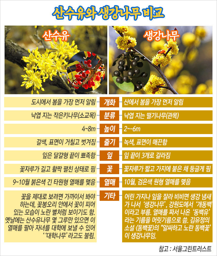 가장 큰 차이는 꽃이 나는 자리 같다. 산수유는 본 가지에서 다시 잔가지가 나와 꽃송이가 달리지만, 생강나무꽃은 보통 본 가지에 바로 꽃이 핀다. 즉 산수유는 꽃자루가 길어서 꽃이 위로 모여 피지만, 생강나무는 가지에 꽃이 붙다시피 해서 피는 것이다.
