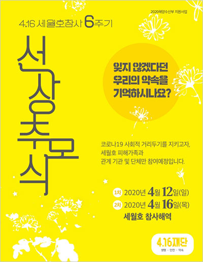 6주기를 맞는 올 4.16에는 두 차례(4.12., 16.) 참사해역에서 선상 추모식을 진행한다고 한다. 코로나19 사회적 거리 두기를 지키고자 피해 가족과 관련 기관, 단체만 참석할 예정이라고. 다시 그 해역에 서게 될 유족들의 아픔을 환기하는 것으로 올 4·16을 맞아야 할 듯하다.
