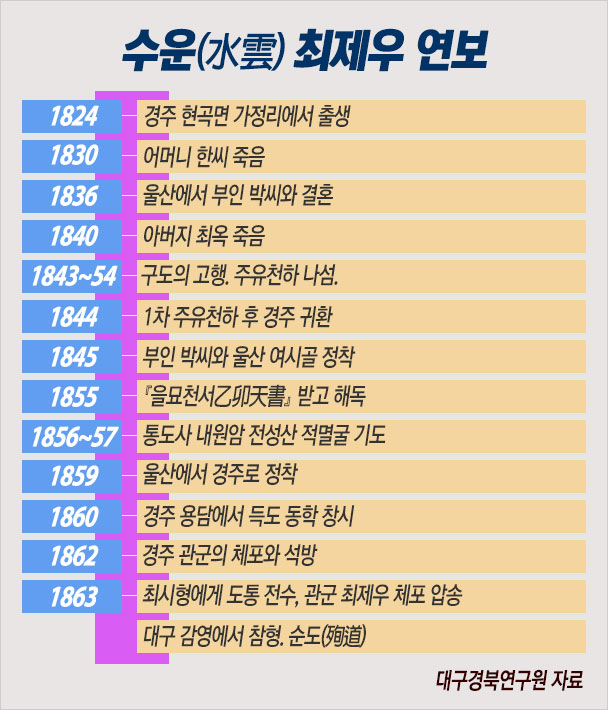 어릴 때부터 총명하여 일찍부터 경사(經史)를 익혔으나 재가녀(再嫁女)의 아들이라 문과엔 응시할 수 없었다. 신분 사회의 족쇄가 그를 옭아매자 그는 새로운 세상을 위한 다른 선택을 했다. 수운은 10년을 넘게 전국을 떠돌며 고통당하는 민중의 참담한 생활을 직접 체험했다.