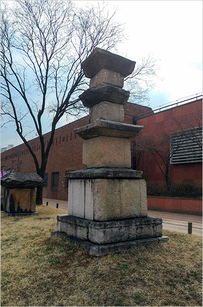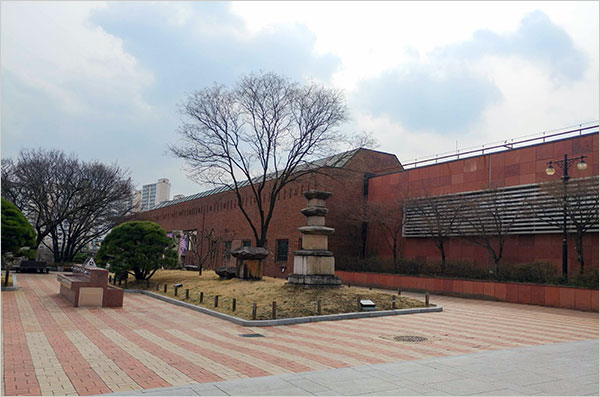 나는 정류장에 가까운 북문으로 박물관에 들어섰다. 붉은 벽돌의 기다란 본관 건물이 우람했다. 건물 앞은 야외 쉼터와 마당과 정원이 이어졌는데 본관 건물 현관을 기준으로 좌우에 각각 탑이 한 기씩 서 있었다. 오른쪽에 있는 게 대구 매여동 삼층석탑이고 왼쪽이 정도사 터 오층석탑이다.