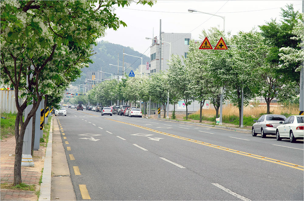지금 이팝나무 가로수는 바야흐로 절정의 개화기를 향해 달려가고 있다. 나날이 피어나는 꽃으로 나무의 외양이 더욱 풍성해진다. 가까이서 보면 길쭉한 꽃잎이 성긴데, 먼빛으로는 그 모양새가 오히려 화사하다. 가로수로 이팝나무를 선정한 젊은 도시 구미의 선택은 후한 점수를 줘도 될 듯하다.