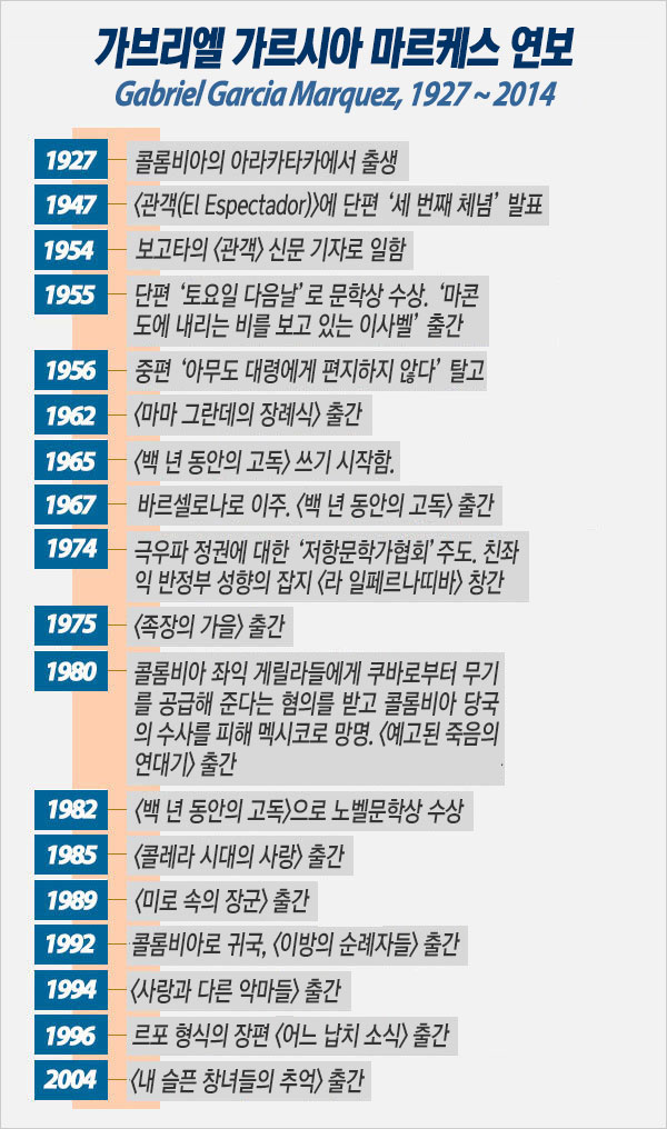 어제 오후에 나는 작가 가브리엘 가르시아 마르케스(1928~2014)의 부음을 전해 들었다. 그는 지난 10여 년간 림프암으로 투병해 왔고, 2012년부터는 치매 증상으로 집필을 중단한 바 있었다. 마르케스는 멕시코시티의 자택에서 아내와 두 아들이 지켜보는 가운데 87년의 삶을 마감했다고 한다.
