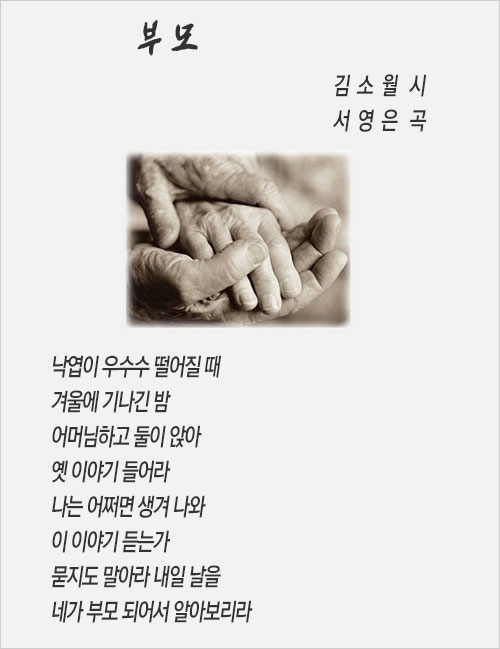 홍민, 그러고 보니 오래된 가수다. 이 저음의 가수가 부르는 김소월의 노래 ‘부모’를 무심히 들어본다. 어머니께서 가신 지 어언 7년, 당신께선 24년 전에 먼저 가신 아버지를 만나 이 자식들이 지켜내는 고단한 세월을 지켜보고 계실까…….