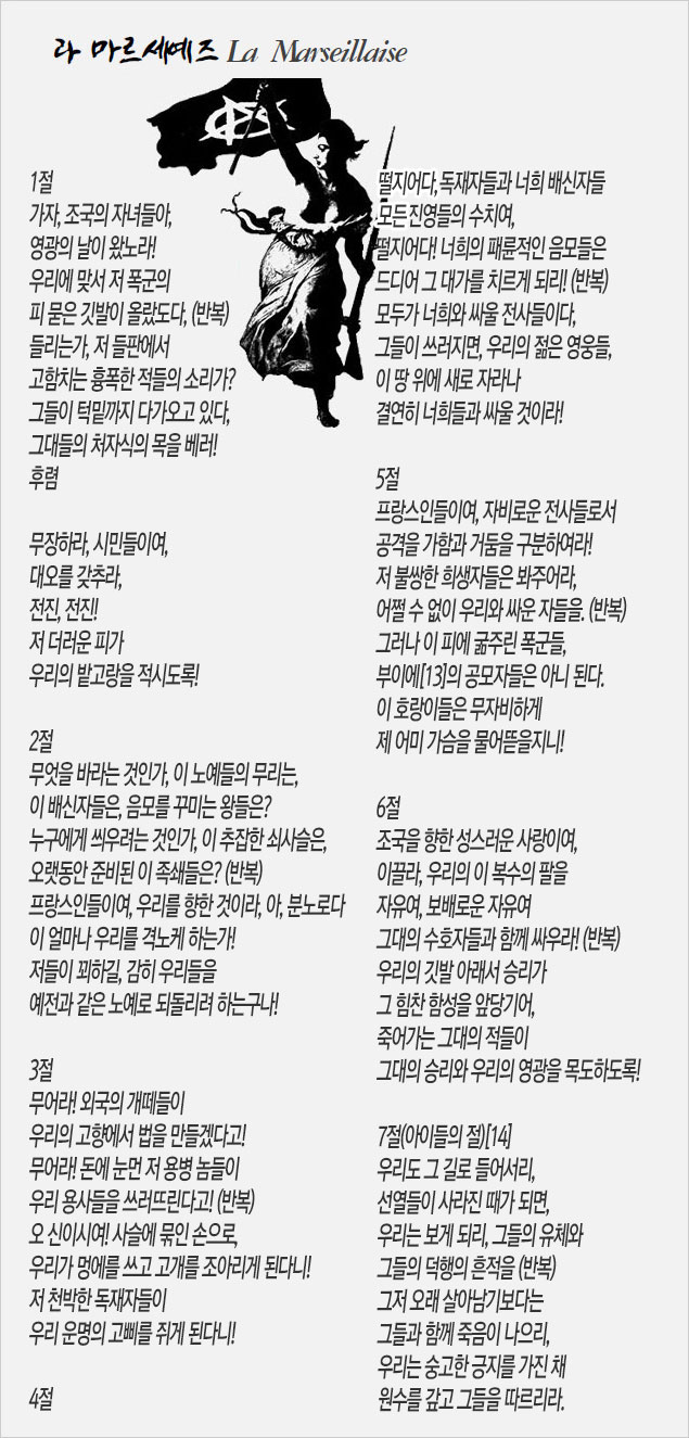 프랑스 국가 ‘라 마르세예즈(La Marseillaise ‘마르세유의 노래’)‘는 프랑스대혁명 때 의용군이 즐겨 부른 노래였다. 라 마르세예즈의 가사는 훨씬 직설적이고 전투적이다. ‘피의 깃발’, ‘야만적인 적군’, ‘적의 더러운 피’ 등의 선동적인 구호가 선연한 것이다.