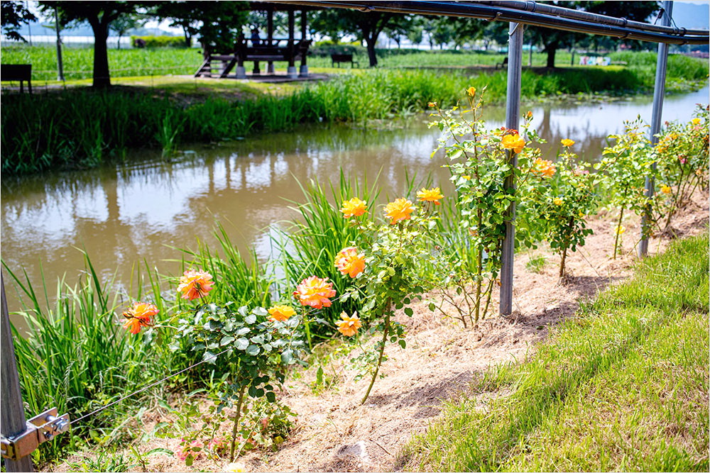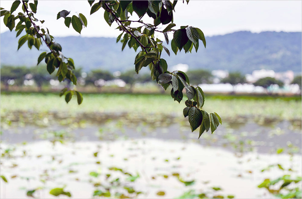 꽃이 지고 난 뒤의 벚나무 잎도 싱싱하고 아름답다. 빨갛게 익은 왕벚나무 열매인 버찌가 까맣게 익어 황톳길에 떨어지고, 상류 끝부분의 연지에는 홍·자·황·백의 수련이 피어났다. 꽃이 지고 잎만 남아도 벚나무는 아름답고, 호수 가장자리에 무성하게 자란 부들과 갈대 등의 수초도 이 난만한 초여름을 풍경을 수놓고 있다.