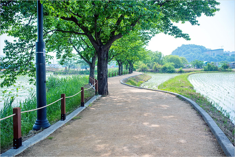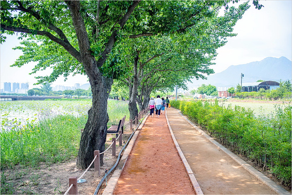 지난해 가을에 짧은 거리지만, 맨발 황톳길이 만들어지더니, 올해 3월에는 호수 상류의 둘레로 황톳길이 연장되었다. 하류에도 굵은 모래(사전에 나오지 않는 국적 불명의 낱말 ‘마사토’의 순화어)로 맨발 길이 조성되면서 샛강에는 아연 시민들의 발길이 이어지기 시작했다.