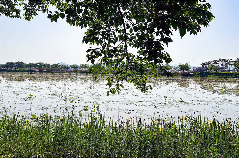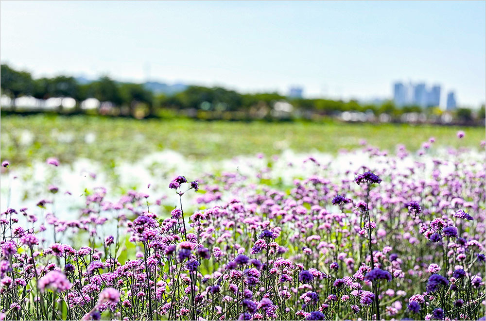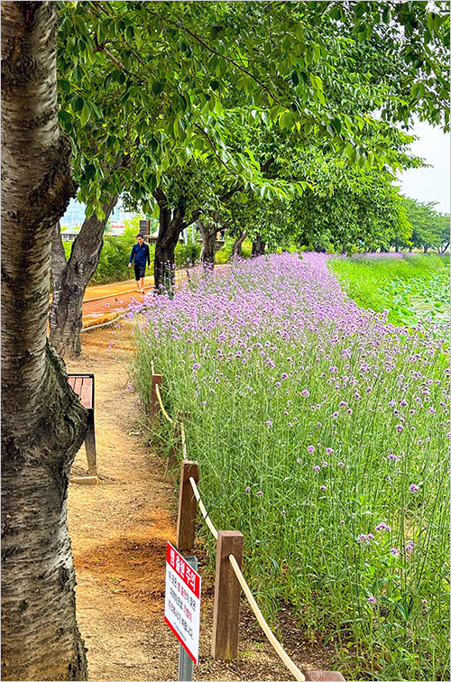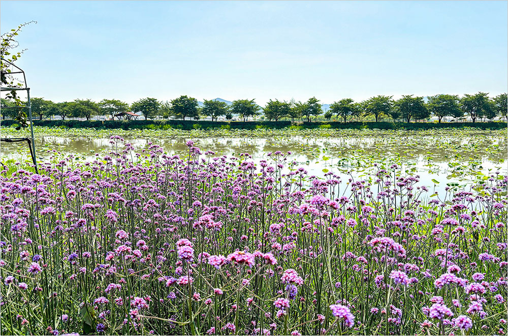 4월 중순이 지나면서 호수에 연잎이 돋아나기 시작하더니 어느새 호수의 수면은 파란 연잎으로 뒤덮이는 중이다. 5월에는 호수 가장자리를 삥 둘러서 노란 꽃창포가 피었고, 어느새 맨발 길 출발지 건너편 물가에는 버들마편초가 보랏빛 꽃을 피우기 시작했다.