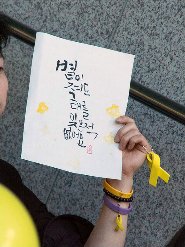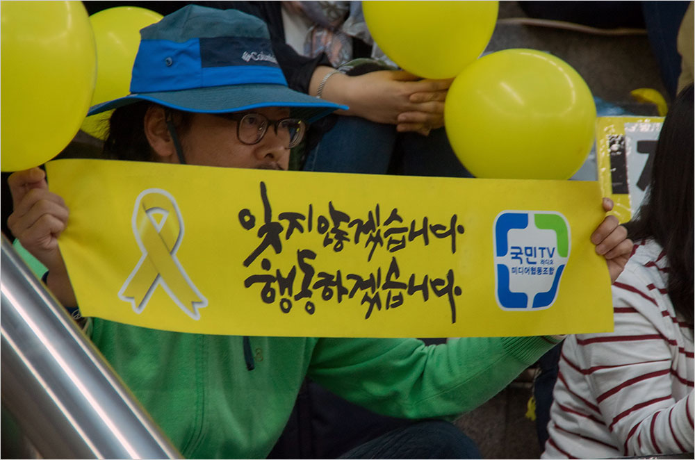 2014년에 세월호 촛불 때의 공기도 무심하기는 마찬가지였다. 서명 등으로 참여하는 이들도 적지 않았지만, 무심히 집회 참가자들을 일별하고 총총히 발걸음을 옮기는 이들도 많았다.