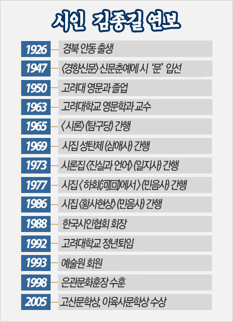 지난 1일, 원로시인이자 영문학자인 고려대 명예교수 김종길(1926~2017) 선생이 숙환으로 세상을 떠났다. 지난달에 부인을 잃고 힘들어하다가 그예 뒤를 따랐다고 한다. 향년 91세. 내외분이 앞서거니 뒤서거니 떠나시어 유족들의 슬픔은 크겠지만 두 분은 인연이 남달랐다고 할 수 있을지 모르겠다.